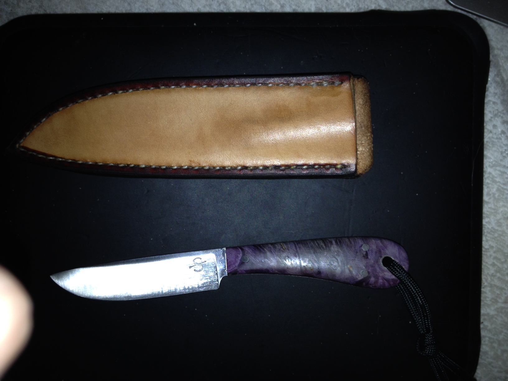 It's a small fixed Tim Scholl in 15N20 with dyed stabilized box Elder burl. Went to Dixie gun and knife yesterday, and I had to buy one because I've been a fan of his work for ages and I can finally afford to spend that kinf of money on a knife for both aesthetic and utilitarian purposes. PRetty friggin stoked.