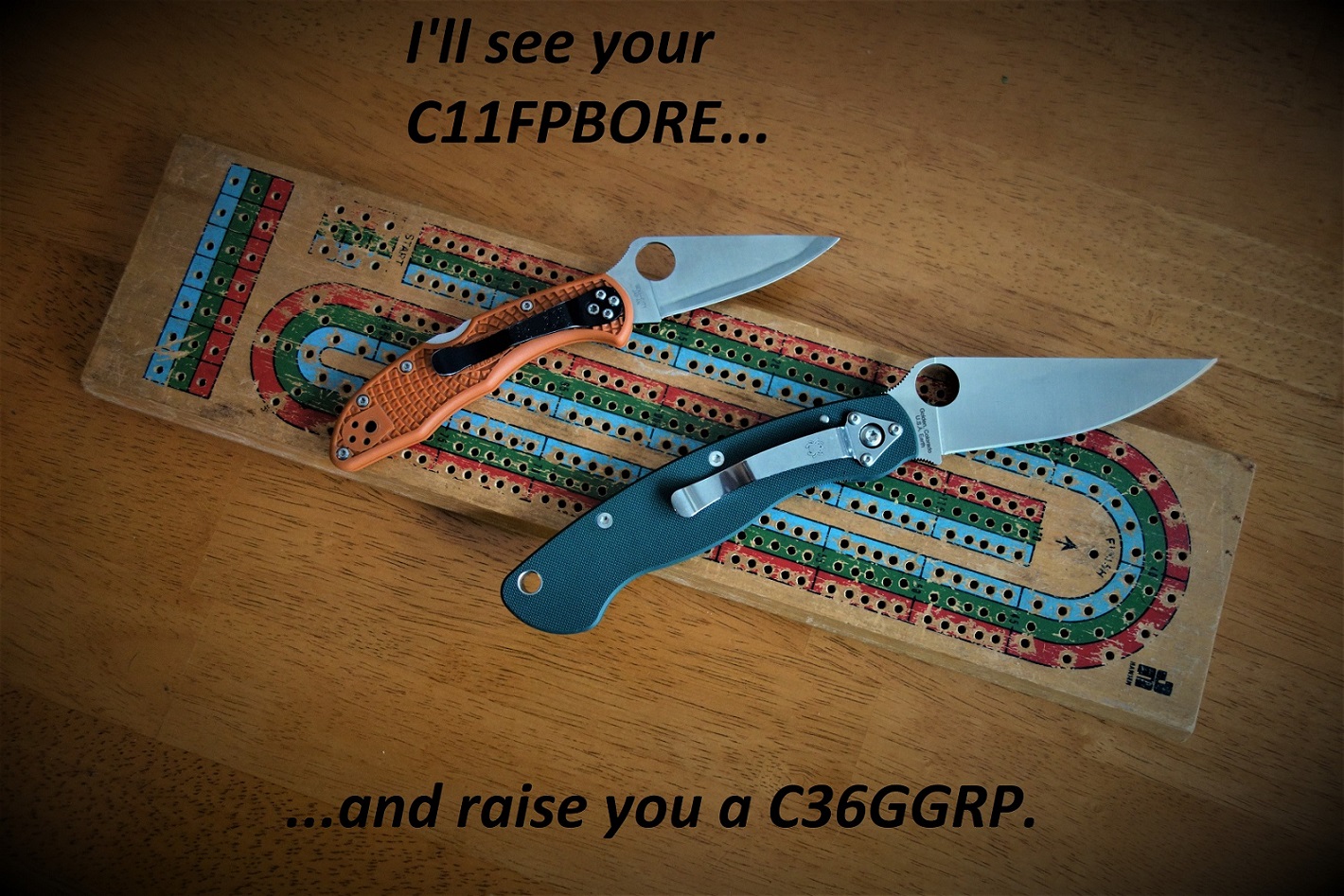Only if its a Spyderco cribbage board :DInvective wrote:Bearfacedkiller, I can match the cribbage board but not the knives.