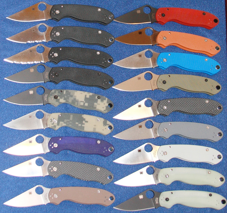 Current collection: ZDP-189 Delica 4, S110V PM2, St. Nick's 4v Para 3, H1 sheepsfoot Manbug, Kapara, VG-10 Dragonfly, ATS-55 Serrated Delica, ZDP-189 MT04 (not broken yet) + Other non spydercos.