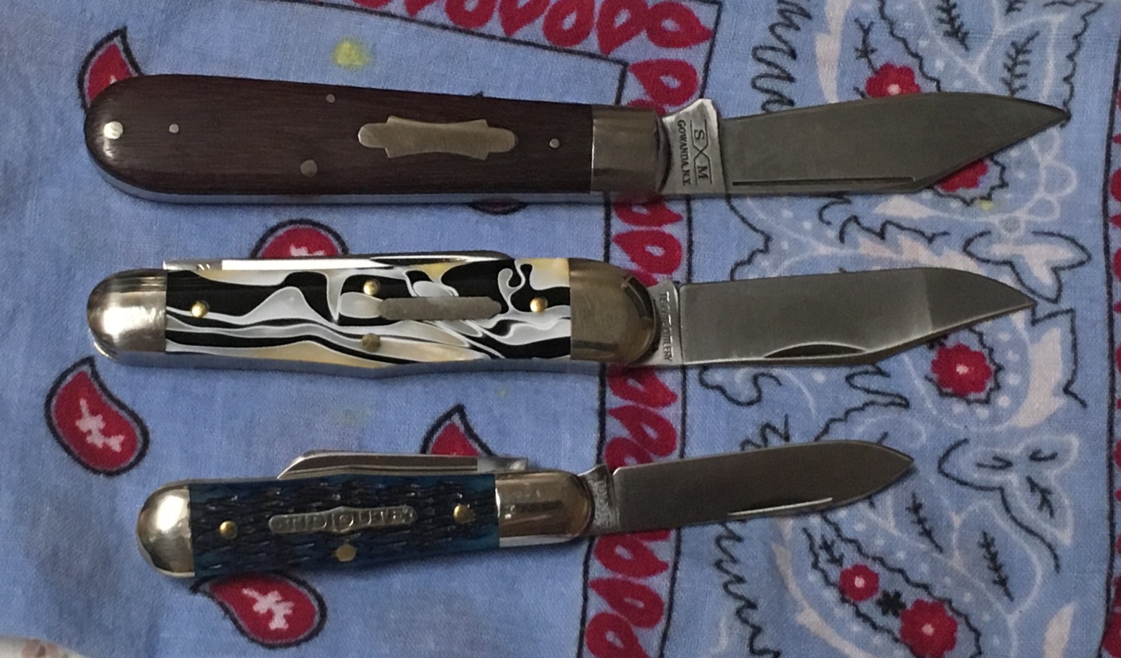 These are my 3 latest traditional knives, a GEC 06 with blue jigged bone, a GEC 29 in acrylic, and a Queen Heritage Jack with wood covers.