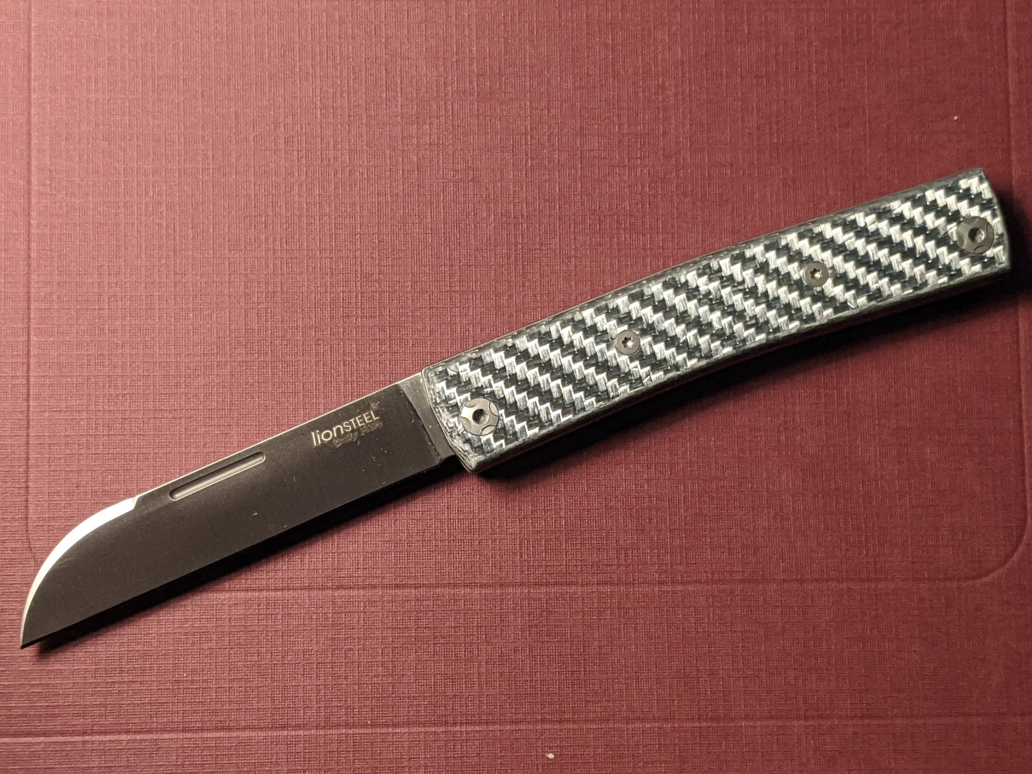 Most of my traditionals are unfortunately in storage, with them mostly being Case and a couple GEC, but I just picked this up from DLT, as it's an exclusive they just dropped: The Lionsteel Best Man sheepsfoot in M390/silver twill carbon fiber: