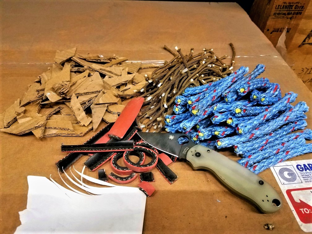 Sliced up a few boxes into pretty small pieces, the brown paracord I cut 225 pieces. I used 75 cuts for the tip area, 75 cuts for the belly and 75 for the heel of the blade. The blue rope is heavy duty stuff, covered in a waxy finish to help keep it bound together. The Para 3 cleanly cut through those pieces while having to use a bit of strength looping the rope around my finger and pulling the rope towards myself as I push cut with the knife. Cleanly cut through every time on the first try. I finished up with various cuts of the heavy duty rubber hydraulic hose. My hand is now a bit cramped haha.