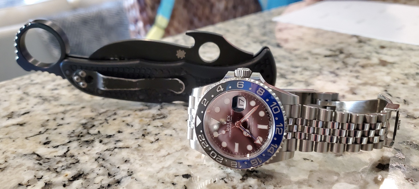 Cool watch and knife, and I like the Hawaiian background foliage. :)