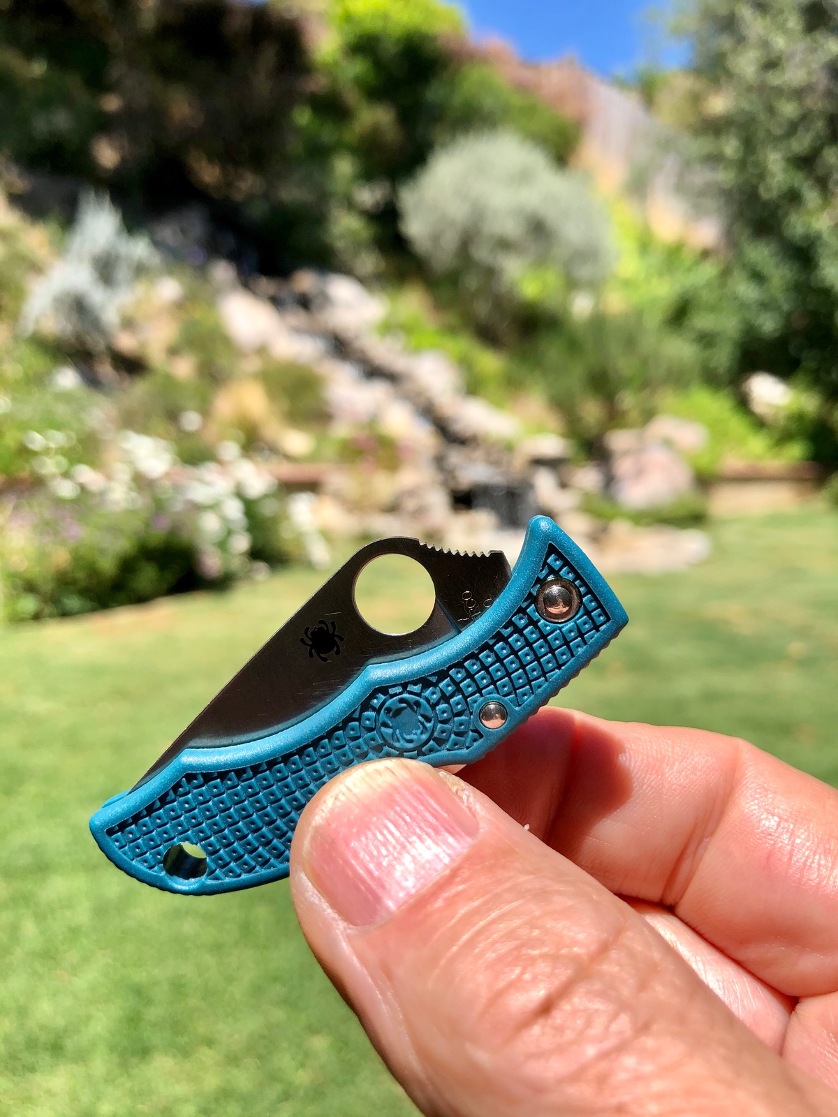 Started the day with a hike in the hills. I wanted to go minimalist: Light shorts, light shirt, light sandals, light leash in case for when the dog couldn't be free, runners water bottle to share. I LIKE having a knife, so this one made it into my pocket. Pic is while we're resting in the yard.