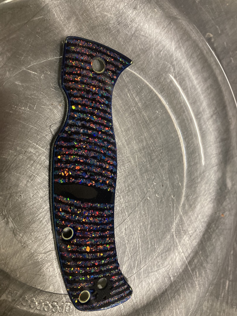 LanM wrote: ↑Tue Feb 02, 2021 12:27 amThanks Salty, do you mean leave it black opal and sprinkle (pave) the center? Since it’s the black opal I think it’ll hide the fact that the g10 stripes are gone a lot easier. I’m going to sand the rest of the center flat, and re-dye it so I can work from a blue background after getting it level. I really liked the abalone idea, but I see it used in either very cheap knives or very expensive ones so I’m not sure if it’ll look like a flea market abortion if I go the abalone route. I’d have to order a little more black opal since I don’t think I have enough for the whole paved area. I have a dozen other colors but mixing them might look stupid. I do have some tiger eye opal that would probably look good with the black.