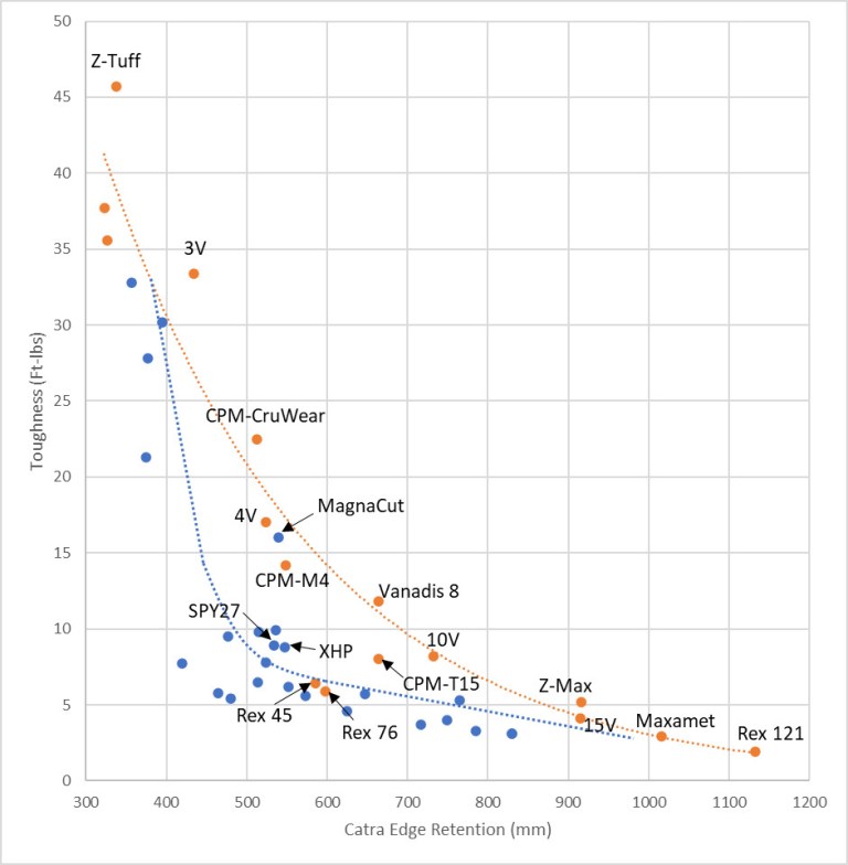 You've all probably seen this graphic but it's worth a repost IMO. Notice how Larrinite breaks through the stainless barrier (blue) and makes it into the tool steel class (orange). Talk about punching above its weight! About the same edge retention as SPY27 & XHP but with double the toughness. My goodness sakes.