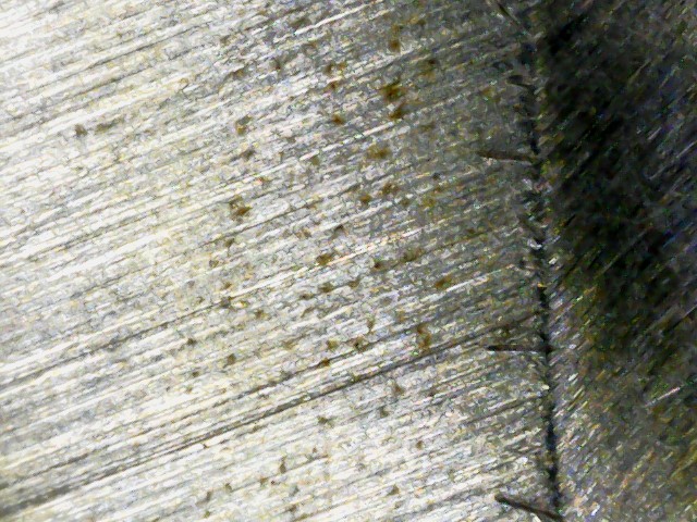 After finding that I decided to check my other knives and found my PM2 Maxamet with pitting and surface rust. I don't remember cutting anything corrosive, it's just a small area that looks like a smudge. This finding made me pull out my usb microscope to see how bad the pitting was.