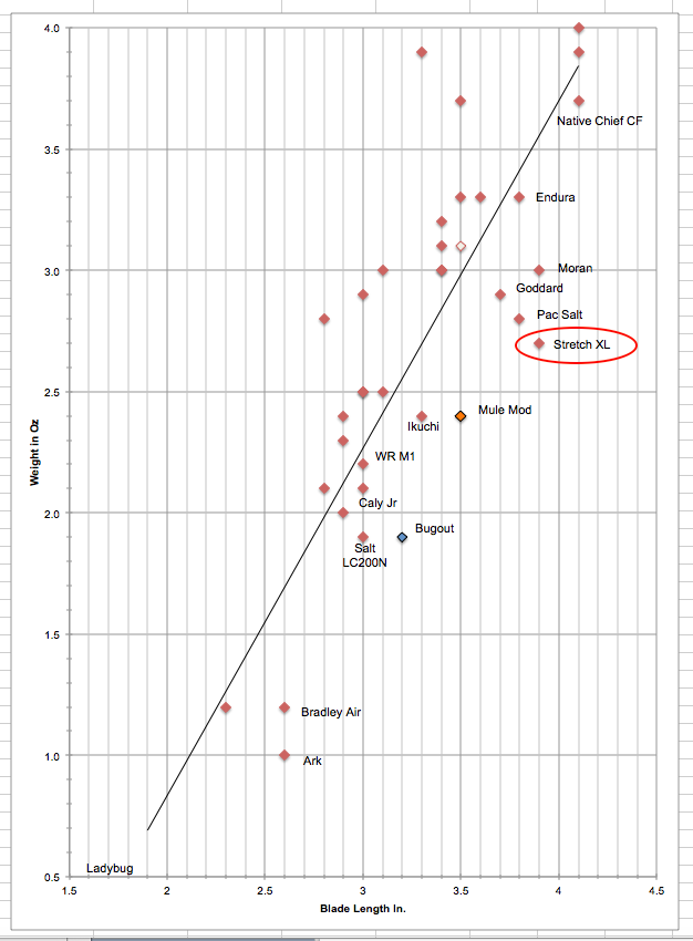 Since edge and blade length are highly correlated, the Stretch XL looks very efficient for its blade:weight ratio also: