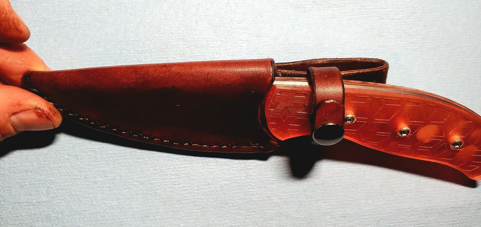 Nice work. I have tried making a couple sheaths and know how hard it is to get the stitching as even and good looking as yours. The tan on the leather is nice too, buff but not too shiny. And then there's the tools and snaps, not enough can be said about proper retention. Thanks for sharing.
