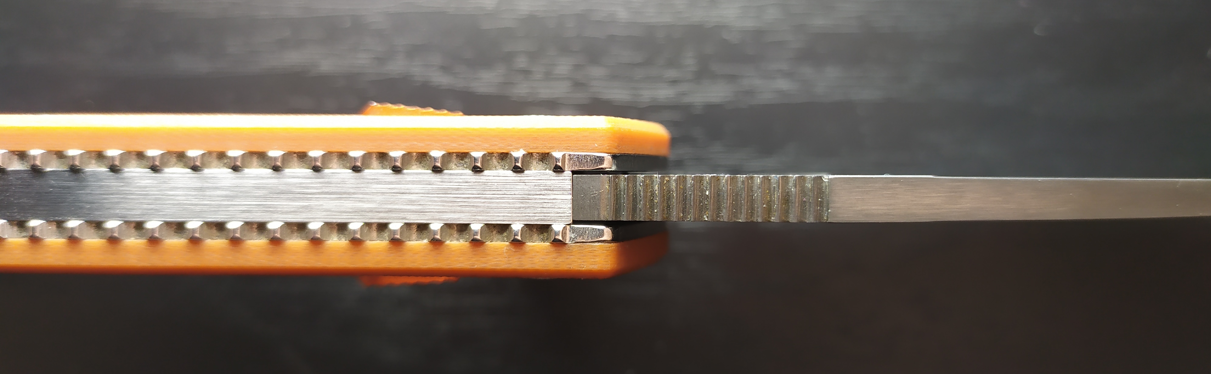 I got no rust spots on the spring, no rust on the bevels and only very minor rusting on the lettering and jimping. I have heard that BD1N is fairly rust resistant, but this was a lot better than I have expected. If this was S30V, the thing would be covered in surface rust (my Schempp Bowie folder got numerous fine rust spots from after slicing an apple and only being wiped dry, but not washed).