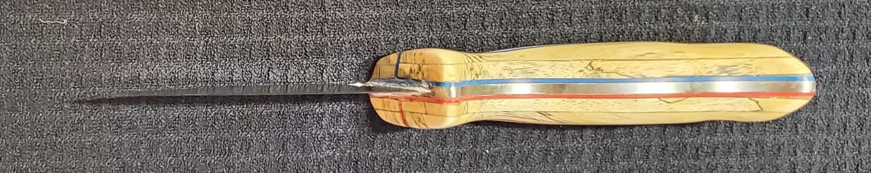 I made a boat knife for him, in honor of both, thin blue line and thin red line. Mule M398, wood is spalted tamarind, lines are g10, handle finish is burnished carnauba wax.