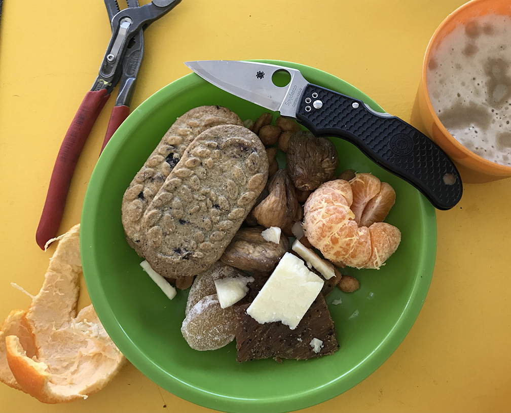 My everyday working lunch, which requires no utensils other than a knife (and clean hands!). Caly Jr in ZDP does the job. (No, I wasn't using the pliers to eat, they were just lying in the way.) That's candied ginger for dessert.