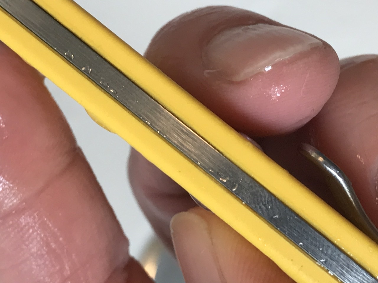 The part of the blade, not covered by the scales, had brown rust on it. Nothing too bad, as the rust could be removed with the hard part of a dish sponge.