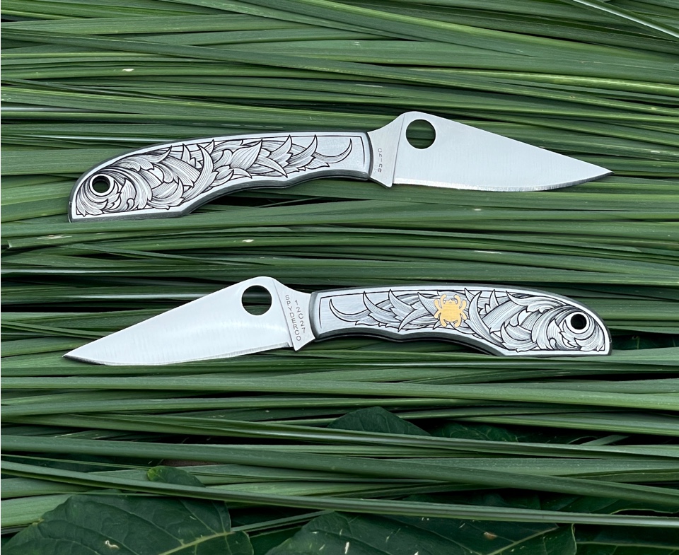 “Golden Spider v01” hand engraved Spyderco Grasshopper. In today’s urban jungle, the Grasshopper is the perfect canvas for my hand engraving and 24k gold inlay.