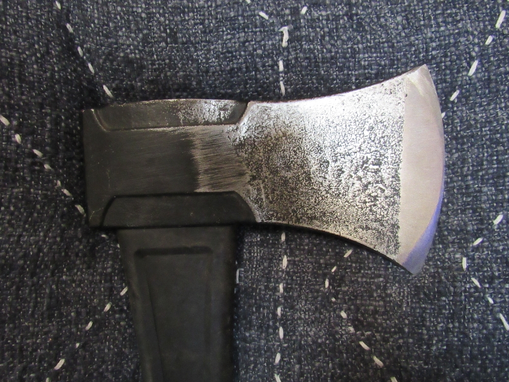 The grinding isn't exactly even on both sides of the axe. I think that it is a little bit my fault and a little bit the axes fault, but whatever the case, the left face came out a bit thinner than the right. I did my best to tweak it to look close but in the end I think it is only an aesthetic issue.