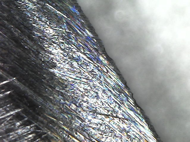 Here is the pic after 600: Here is the result after the 1200: Then here is after the stropping: None of these felt really sharp on a 3-finger test. I never felt or saw any burr form. Also, the 1200 diamond plate also feels WAY too smooth now. It's far smoother than the 8k diamond plate. I am not sure how much more cutting power it has left, so this could get expensive if you had to sharpen this material often, or need to work out chips (made a little one on the corner of the plate and and did get it out). I can't really quantify the plate effect, but it definitely looks a bit different. It may look like a focus issue, but it is different through the range of focus. The very corner of the plate still looks like the before, and everywhere in the middle looks like it has less "depth" in the media.