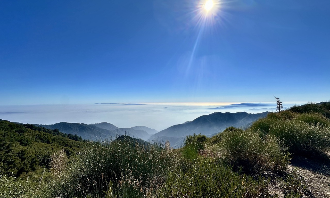 Look closely. That little dark blob poking through the clouds is Downtown Los Angeles. You can spot the Wilshire Grand, the tallest building west of Chicago, at 1,099 feet. Santa Catalina Island is on the horizon, about 65 miles away.