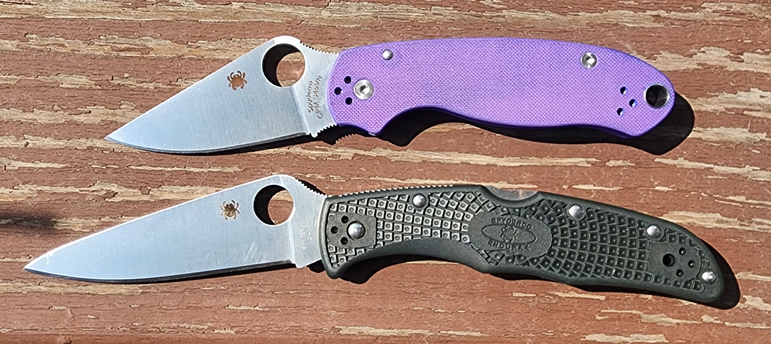 My first try at coloring knife scales. My sister did not care for the pink scales on the para 3 I bought her. I used rit sapphire blue on them. It came out a nice lavender shade which she likes. I dyed my endura with earth brown scales in the same batch of dye. It came out a lot like British racing green. I think for my first try they both came out pretty nice.