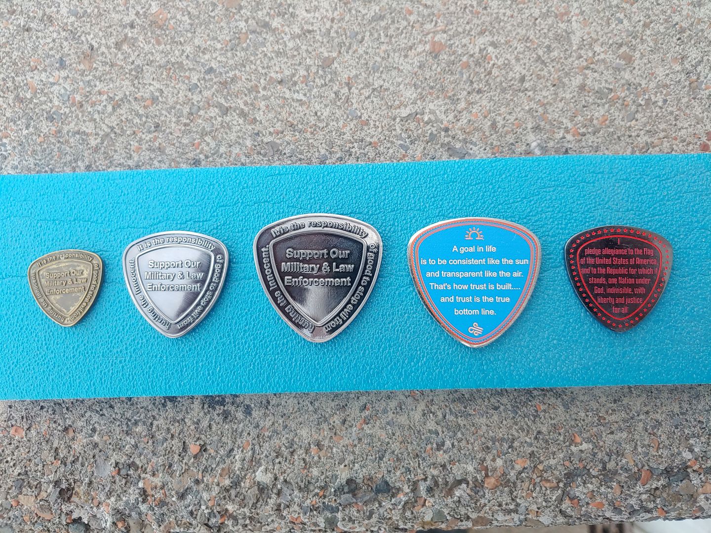 Spyyderco began making "Challenge Coins" a decade plus ago. The original coins were made to show support for Law Enforcement and Military. Both Military and Law Enforcement were beginning to get a bad rap for a variety of mostly political reasons. There may be a small percentage of Cops and Soldiers that are not honorable, but the trend was to paint them all with a broad brush as being bad. We felt that we wanted to do something to show our support for the very many dedicated Military and Law Enforcement officers doing a good job. The early coins were smaller and I kept making them larger and larger until I was satisfied they were easily read. The wording hasn't changed, only the size and colors.
