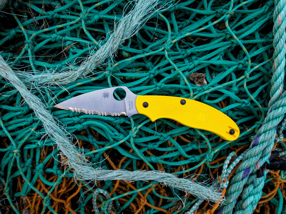 Image description for screen readers: A folding knife with a 3-inch serrated blade and yellow handle, sat atop a mound of assorted ropes and netting. The netting is a mostly teal-coloured netting with some light-blue braided mooring line and some orange twisted-hemp rope.