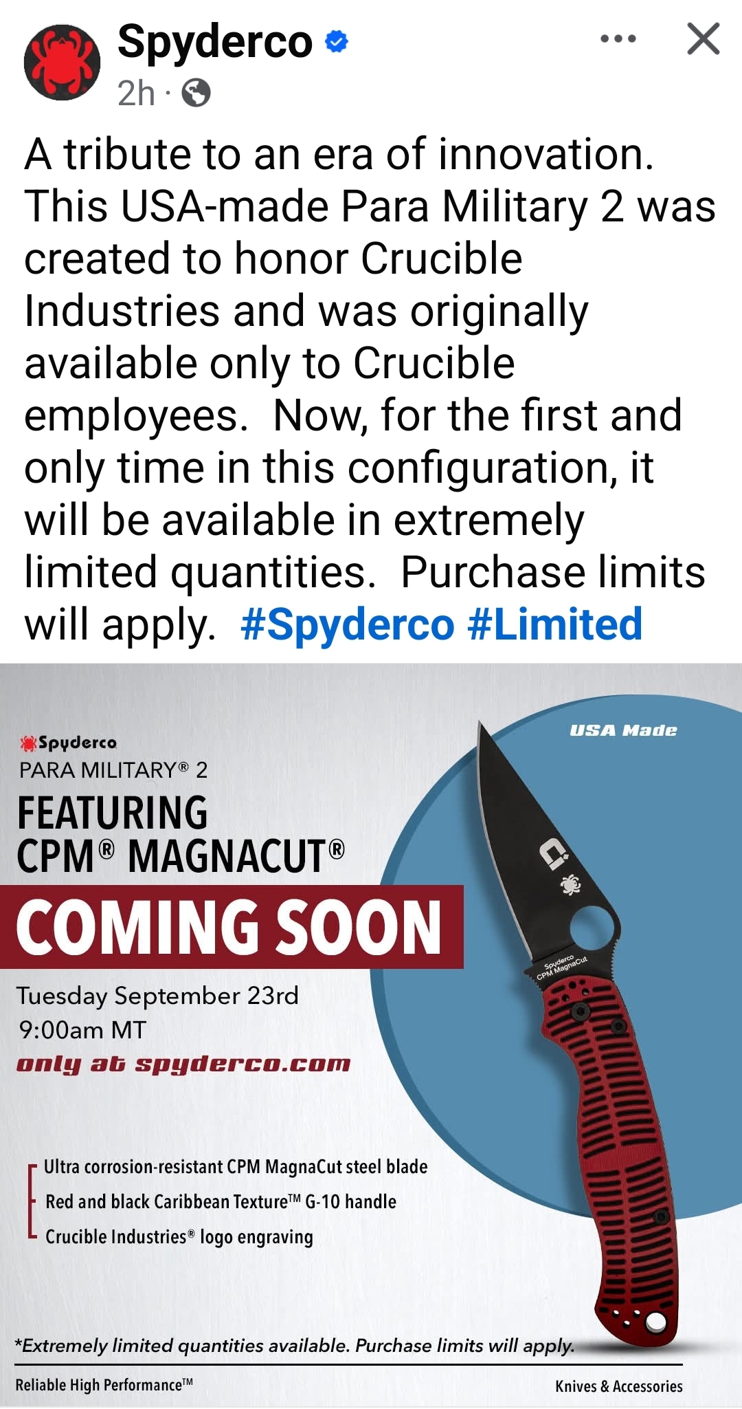 ParaMilitary2 Salt CPM-Magnacut Black DLC Blade PlainEdge Black & Red Grooved G-10 C81GBKRDMCBKP2 Crucible (USA) - APR 2025