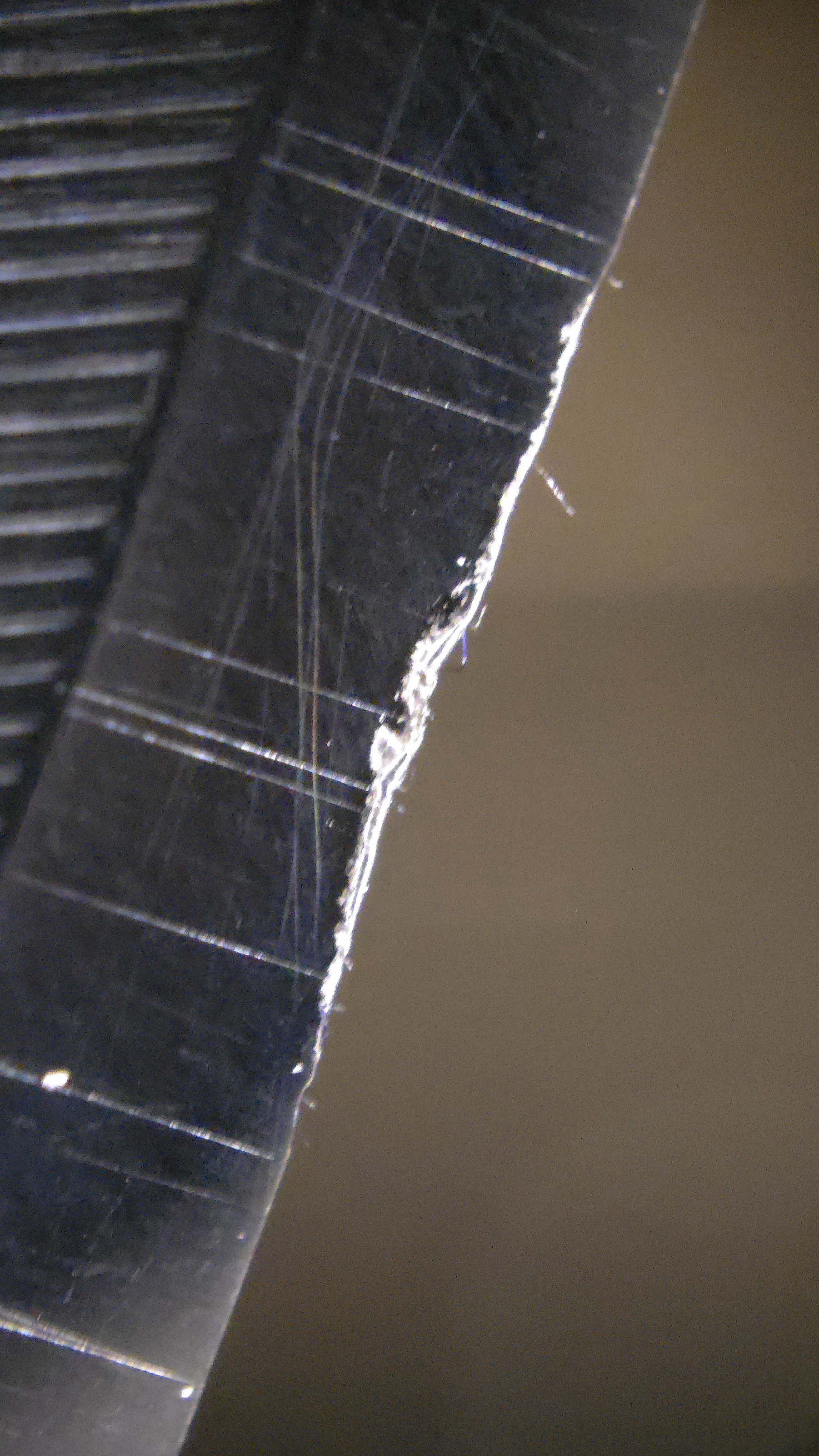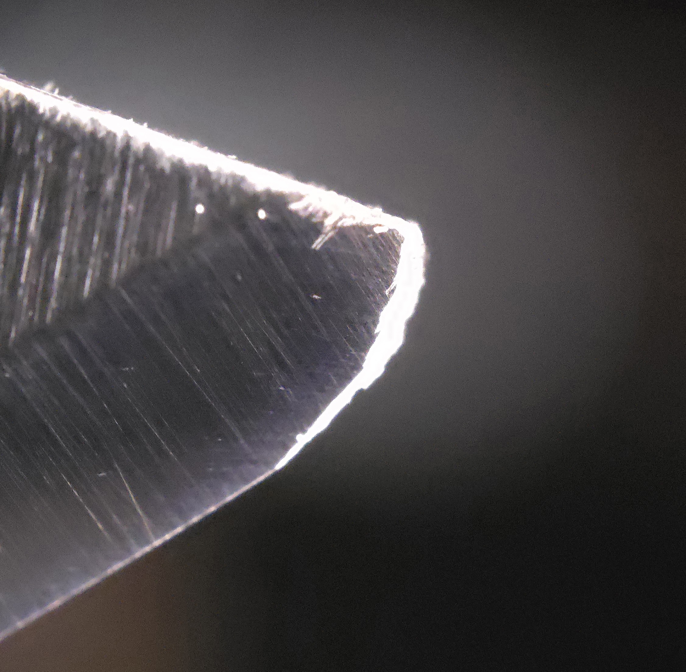 P.S. In the close-ups, the damaged areas picked up some fibers from my microfiber cloth - those aren't burrs/wires from sharpening.