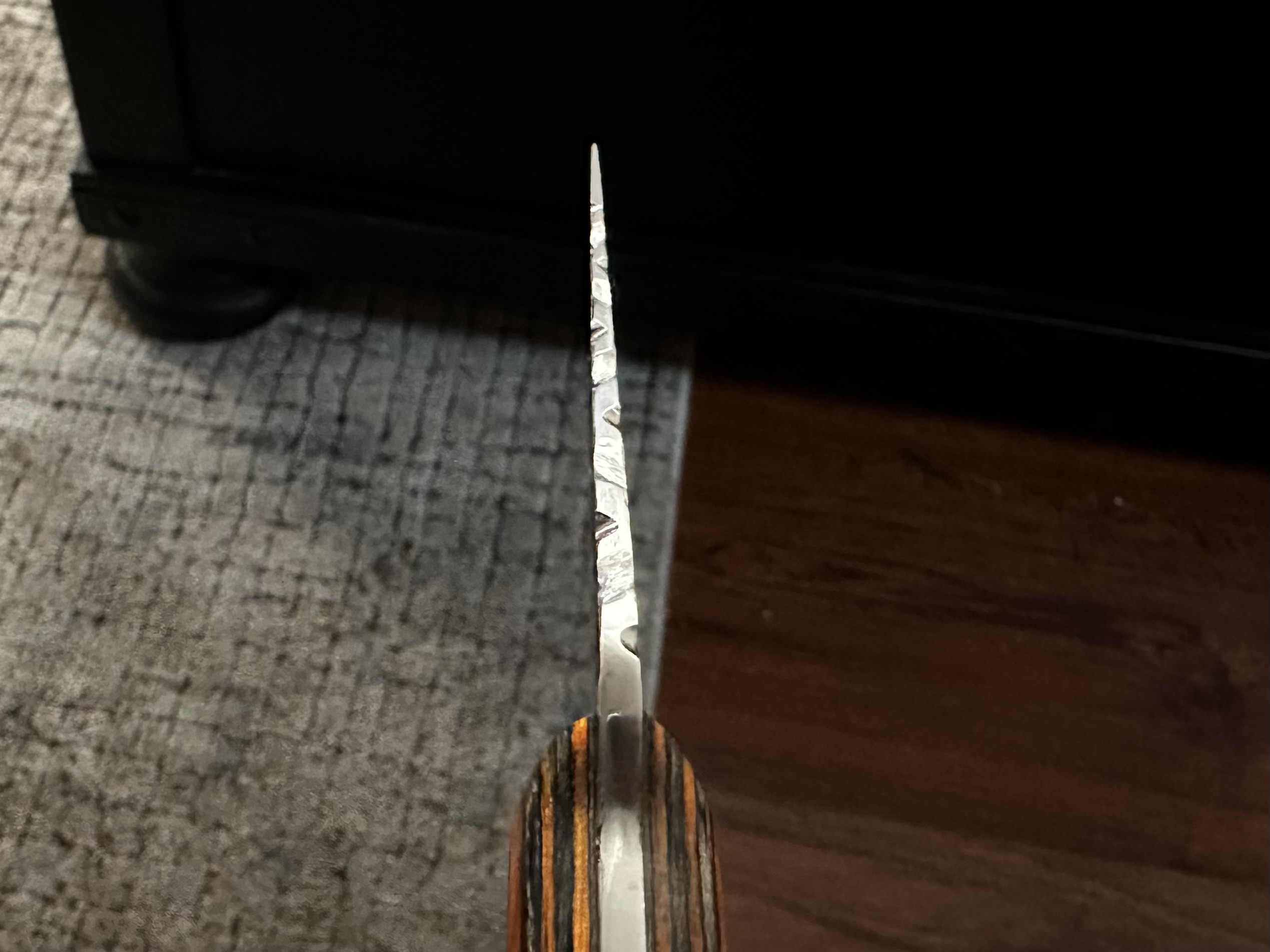 Really it’s just a vine like pattern. It is also a different way to add jimping which I wanted because I added a finger choil to choke up on the knife. When I choke up I place my thumb on the spine. In addition to that the spine now strips wire pretty well