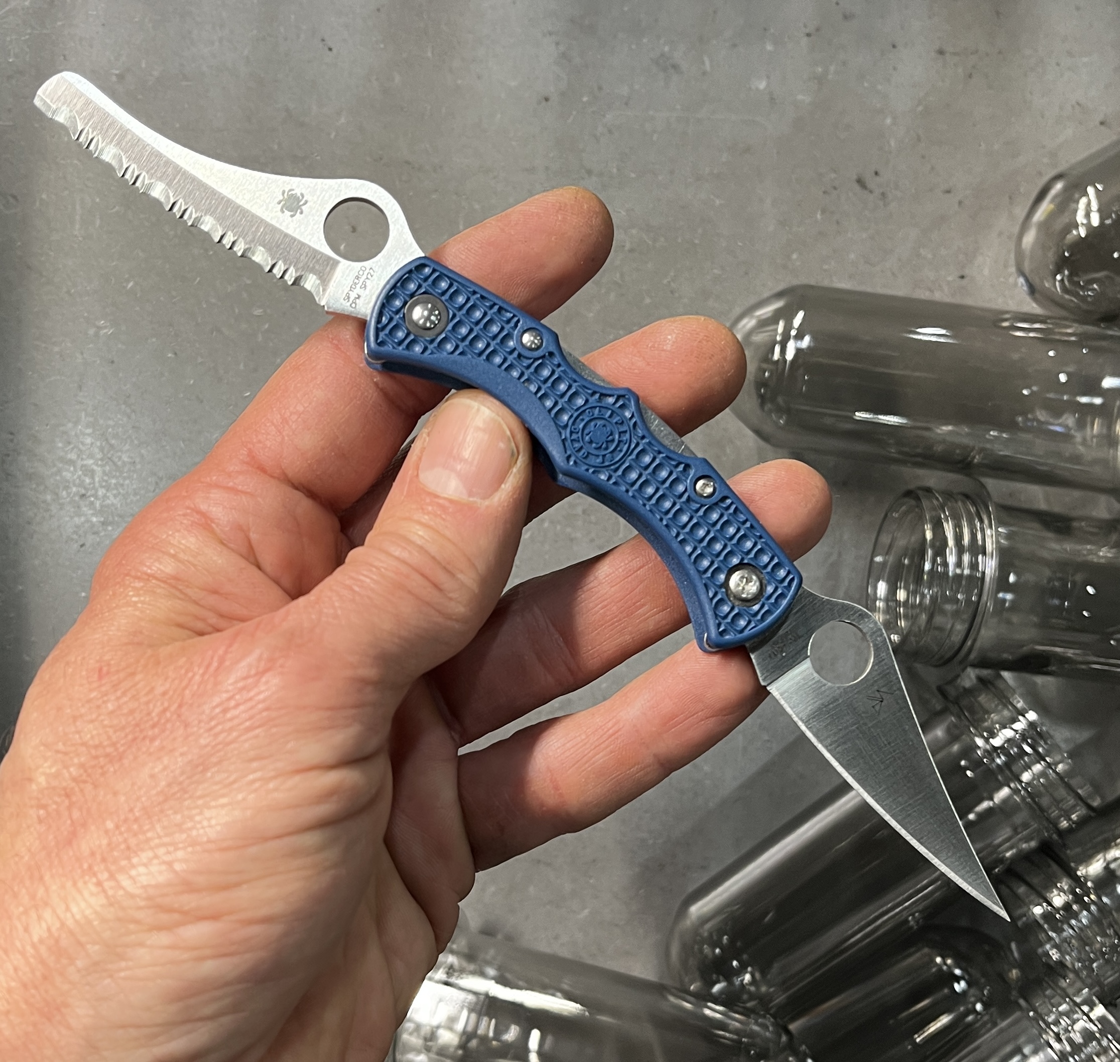 Also, when I cut paracord, I like to get a clean, straight cut, so I don’t fold the line and cut, but I lay it down and push down against something to cut it. This necessitates using the tip of a SE blade, and usually the belly of a PE.