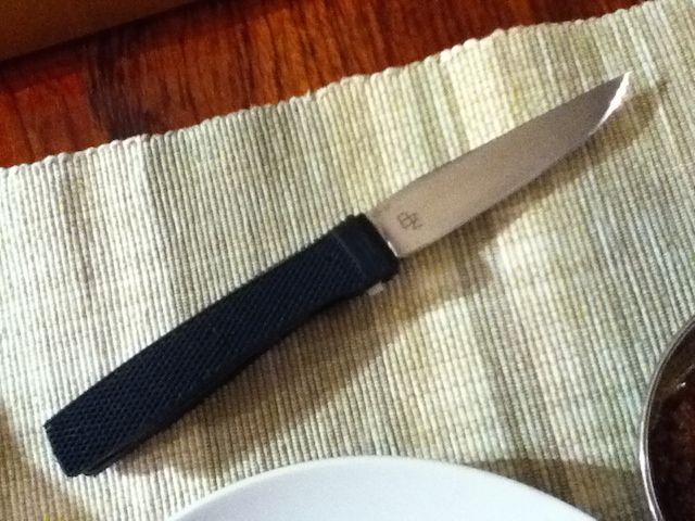 Brad Zinker Urban Trapper ; took off G-10 super thin scales ; put on a Kray Ex handle from a Cold Steel Kitchen Classic cut and planed to fit the Trapper . One of my all time favorite users by the way .