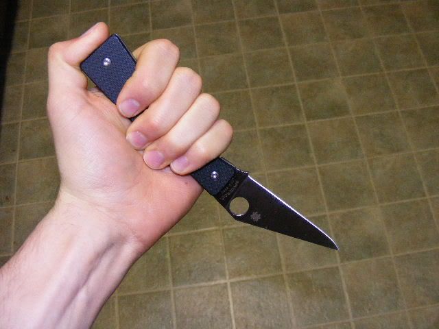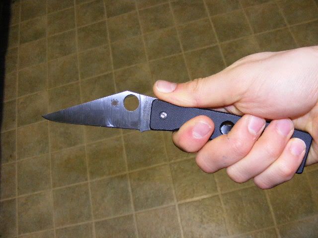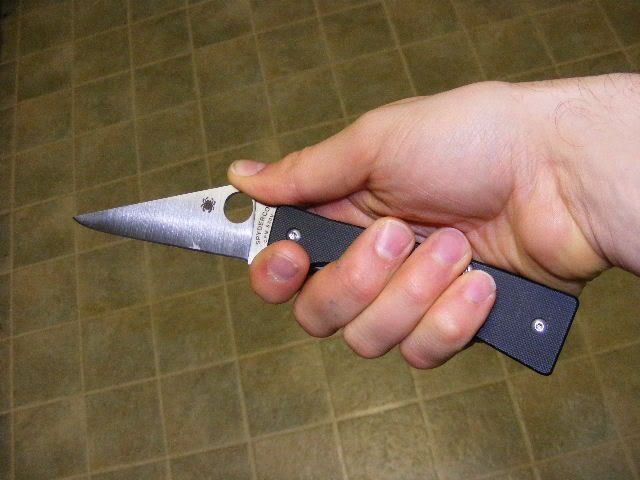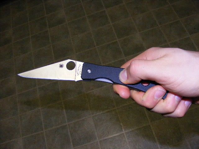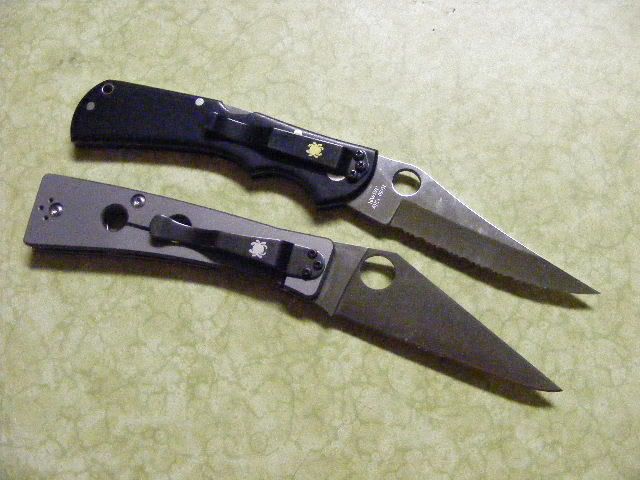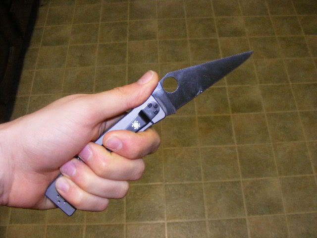 The clip is perhaps the best-looking clip I’ve seen on a spydie to date. It’s a very dark grey (perhaps titanium, as well??), with a silver-grey spyderbug on it. The look is in- between the “classic” Spyderco clip of yesteryear, and the new “hourglass” shape.