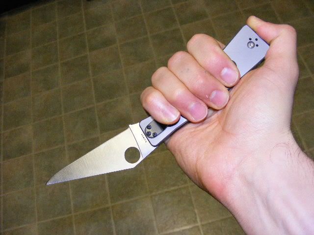 The Reeve Integral Lock is as awesome as you’d expect… especially in titanium. I confess that this knife has gotten me very psyched for the RIL Sage. It certainly feels great to have a Ti Spydie in your pocket! Carried tip up (as many knife knuts prefer), you have a gorgeous, masculine-looking chunk of Ti peeking out of the top of your pocket. Carried tip down (as I prefer in a knife this size… love those spyderdrops!), the effect of the knife in the pocket is more subtle. It draws extremely quickly into a spyderdrop. It’s an easy open, easy close piece. Action is smooooooth… yet not smooth enough to get you nervous.