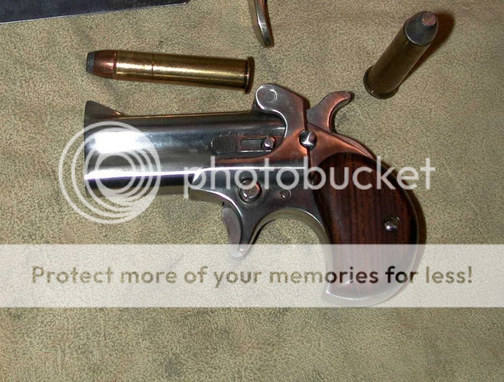LOL....I don't call it my boom stick....I call it my "Walnut Howitzer" I have a derringer made by American Derringer corp. in 45-70....Talk about recoil lol...The top barrel is plugged with steel to keep the recoil down...haha...so there really is only one shot...the 45-70 rounds goes the entire length of the barrel and almost looks likes it's sticking out...Walnut is to describe what it feels like you are holding in your hand for a grip.....LOL...If it hits its target...well that target is destroyed, so you don't need more that one round anyway...if you miss and you are at contact range...the muzzle blast and flash will knock out your opponent unconscious on the spot.....LOL.....either way it's a good thing......Doc :)VashHash wrote:I have a 45-70 crack barrel that I call my boom stick. Still working on a sawed off 12ga. I thought about pistol gripping the 45-70 just didn't get around to doing it yet.