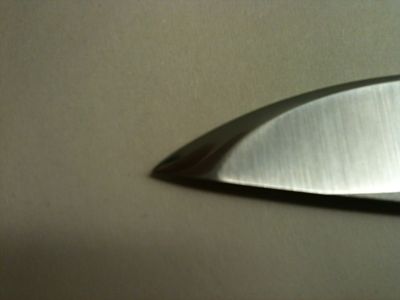 Believe me, I get the concept of the knife -- that's why I bought it -- great slicing for a blade of thick stock due to a deeply hollow-ground blade, along with a super-strong tip for durability in piercing tasks. But it still has to be a knife, and in my humble opinion, the edge grind of the entire blade was too obtuse to be a great slicer, and the tip grind was much more "splitting axe" than "strong knife." I think you can see from the photo of the tip from spine view that the tip is still plenty robust.