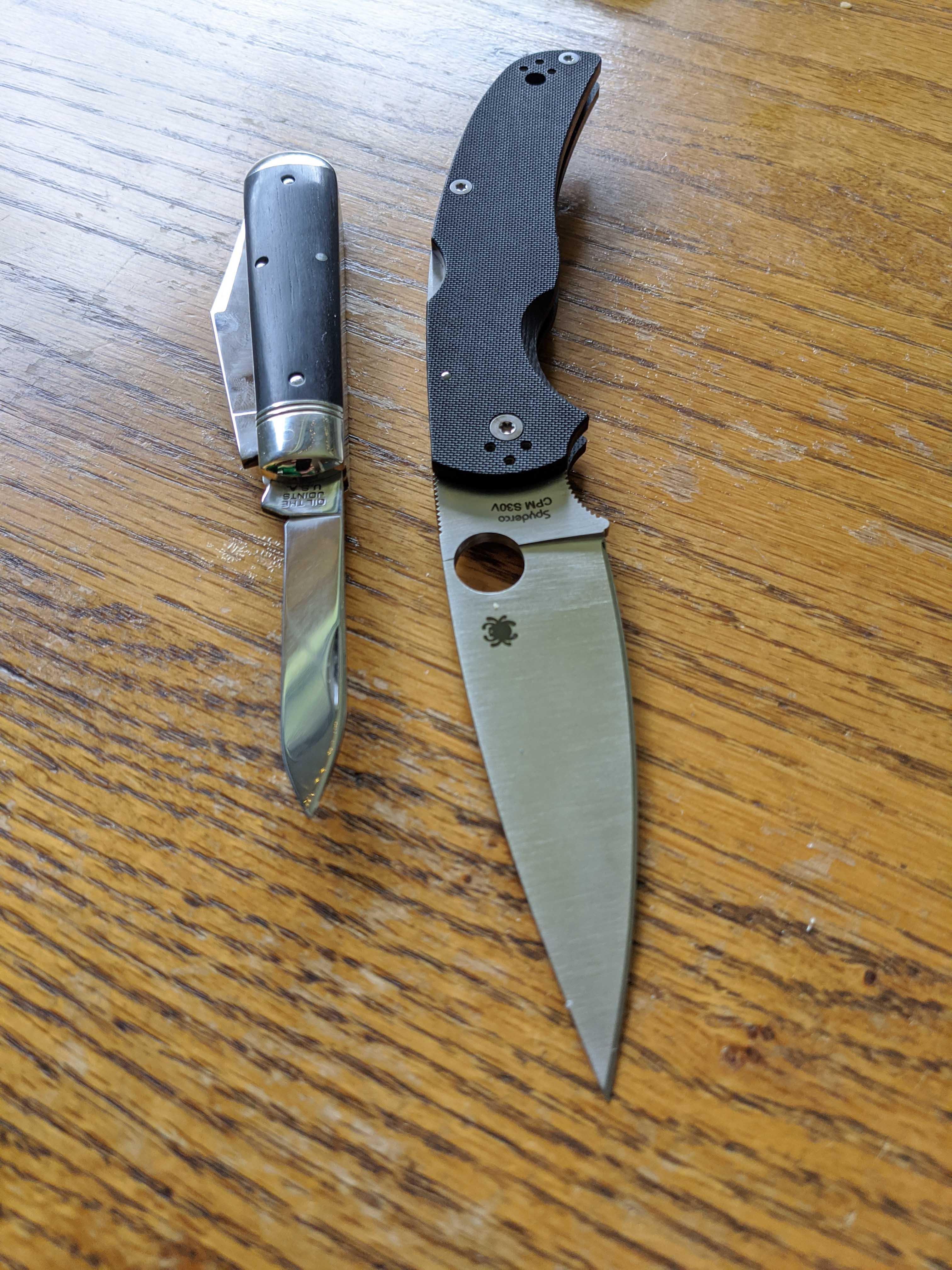 These are my 3 latest traditional knives, a GEC 06 with blue jigged bone, a GEC 29 in acrylic, and a Queen Heritage Jack with wood covers.