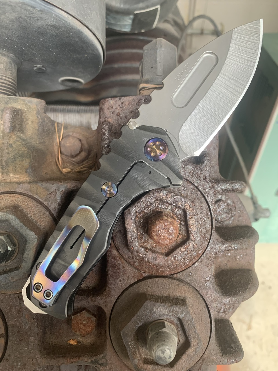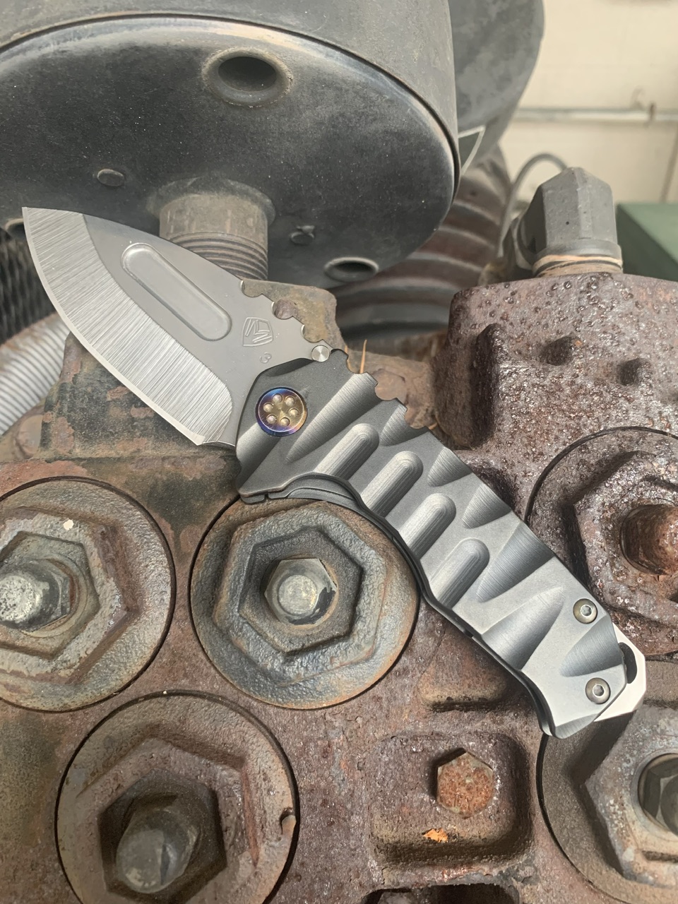 Kunwu Chad. It's a odd one but I can't stop carrying it! It's got a very aggressive texture, which matches the nail-file grade thumb studs and crip lock bar studs. Great knife for winter gloves. It comes with a wire clip in addition to the milled clip, and also some stronger springs for the lock bar.