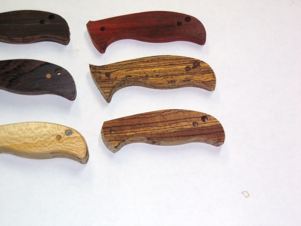 Some members on the forum approached me (PM) and wanted to know if I would make some basic scales for them. Here are some pictures of scales I have been working on. Several different types of wood. Several different stages of completion. On the piece of Paduak (redish orange board) in a clockwise order starting at bottom left. Quarter sawn Beech, Cocobolo, Paduak, 4 Curly Maple.