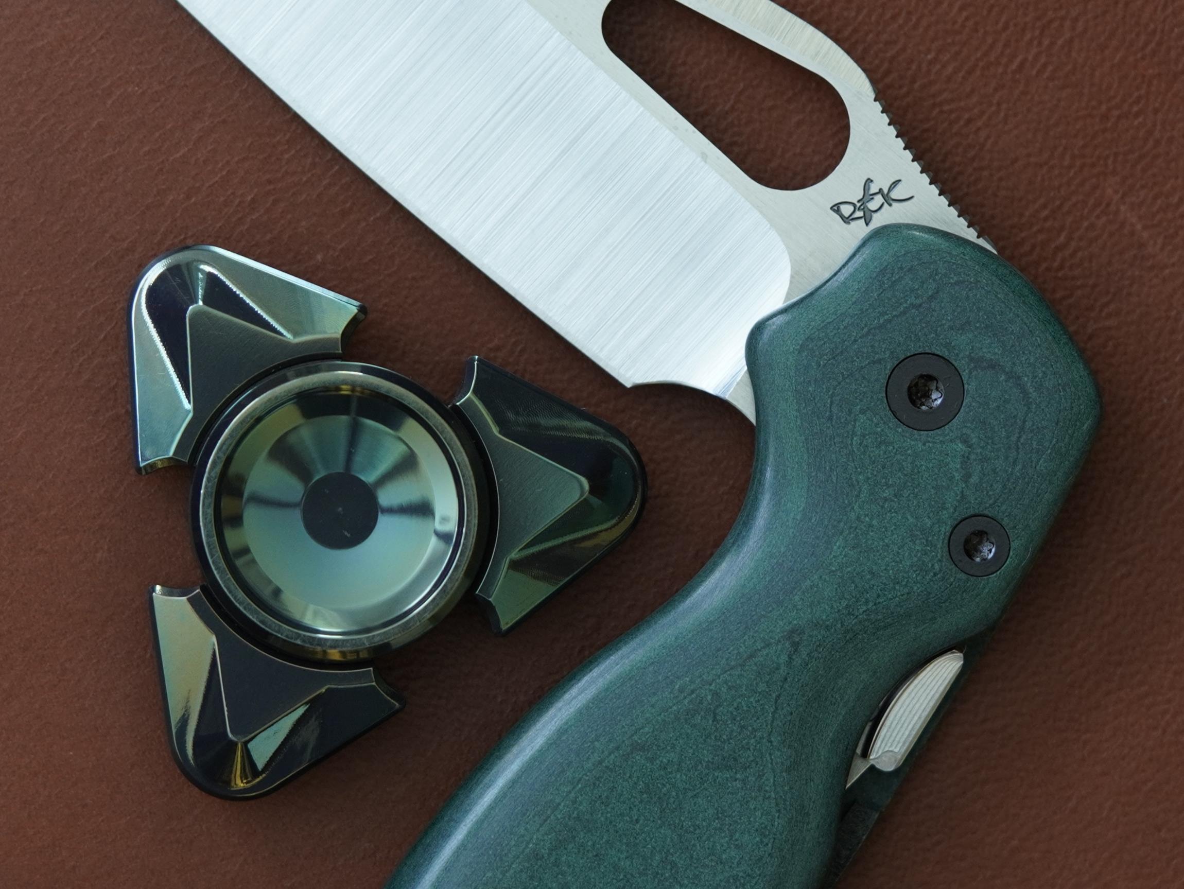This is a PM2 with vintage emerald green paper micarta scales. Zirconium Vader with oil slick finish for scale and contrast. There is also a blade by REK in S90v that I'm really enjoying.
