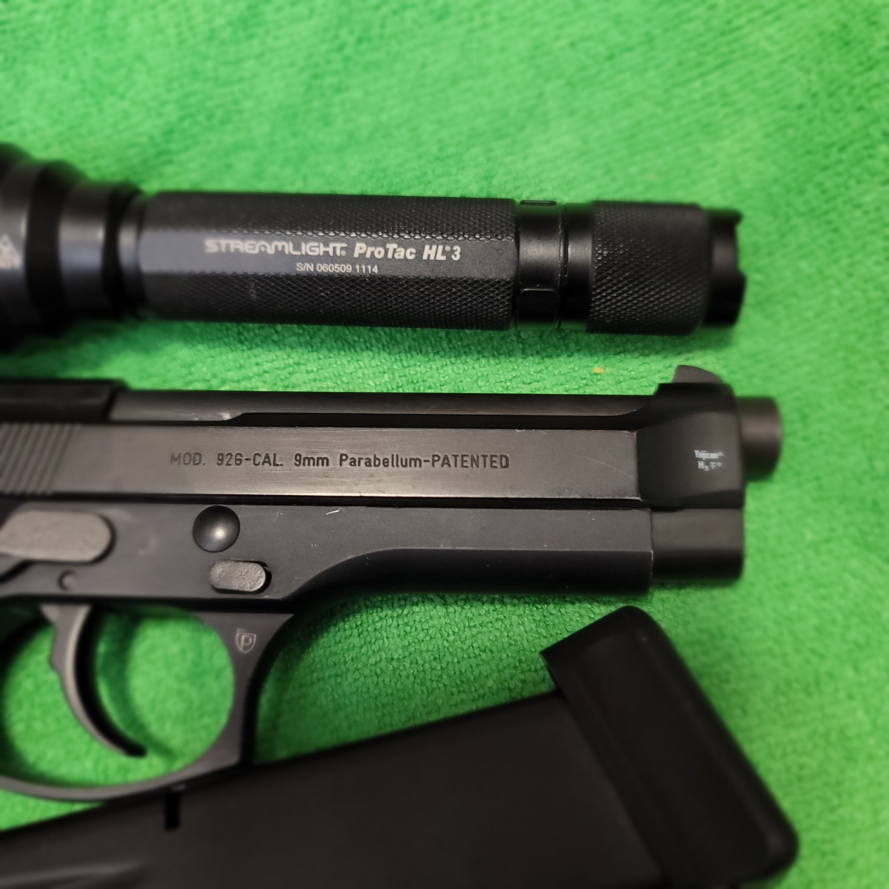 This is my Beretta 92-G with 20 round mags, Spyderco-Police 4 with K390 steel and black scales and a Streamlight ProTac - HL3 torch.