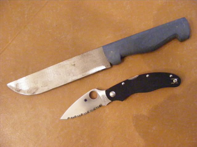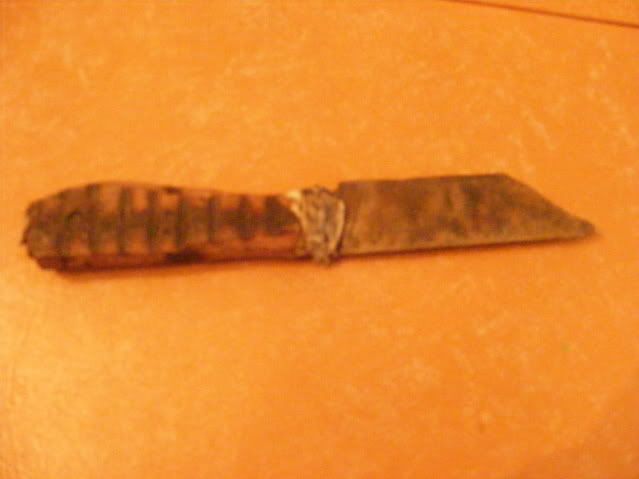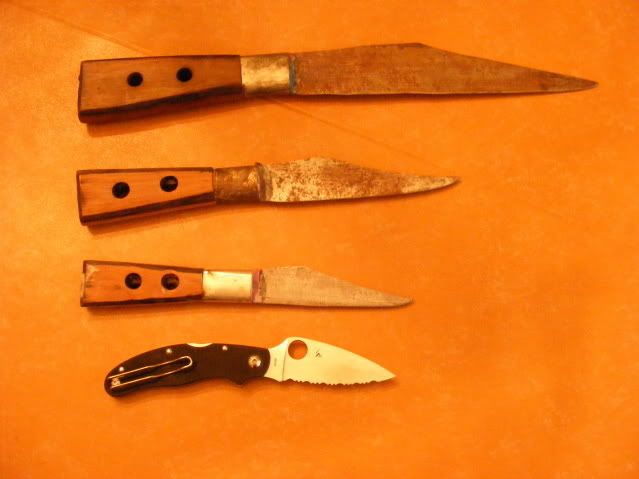 The mpoko (knife) in the middle is sized the same as the blade I sent to Sal. The large one was put to work quite a bit in the bush, and in my village. I used to be pretty good at killing the speedy little house lizards with them... :eek: The smaller knife was custom made, against the blacksmith's wishes... I had to pay him extra to do it. He kept insisting that a knife that small was useless.