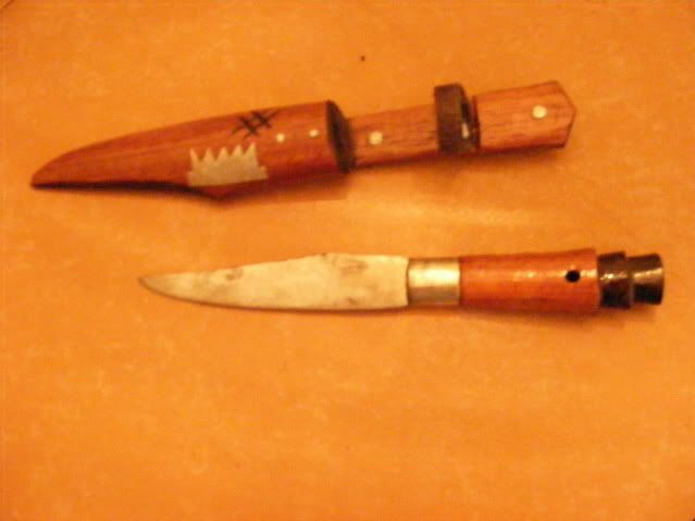 Lunda knife with wooden "case" (sheath). Bought on a roadside in Mwinilunga District of Northwest Province. These are fancier knives, sold to weathy Zambian travellers.