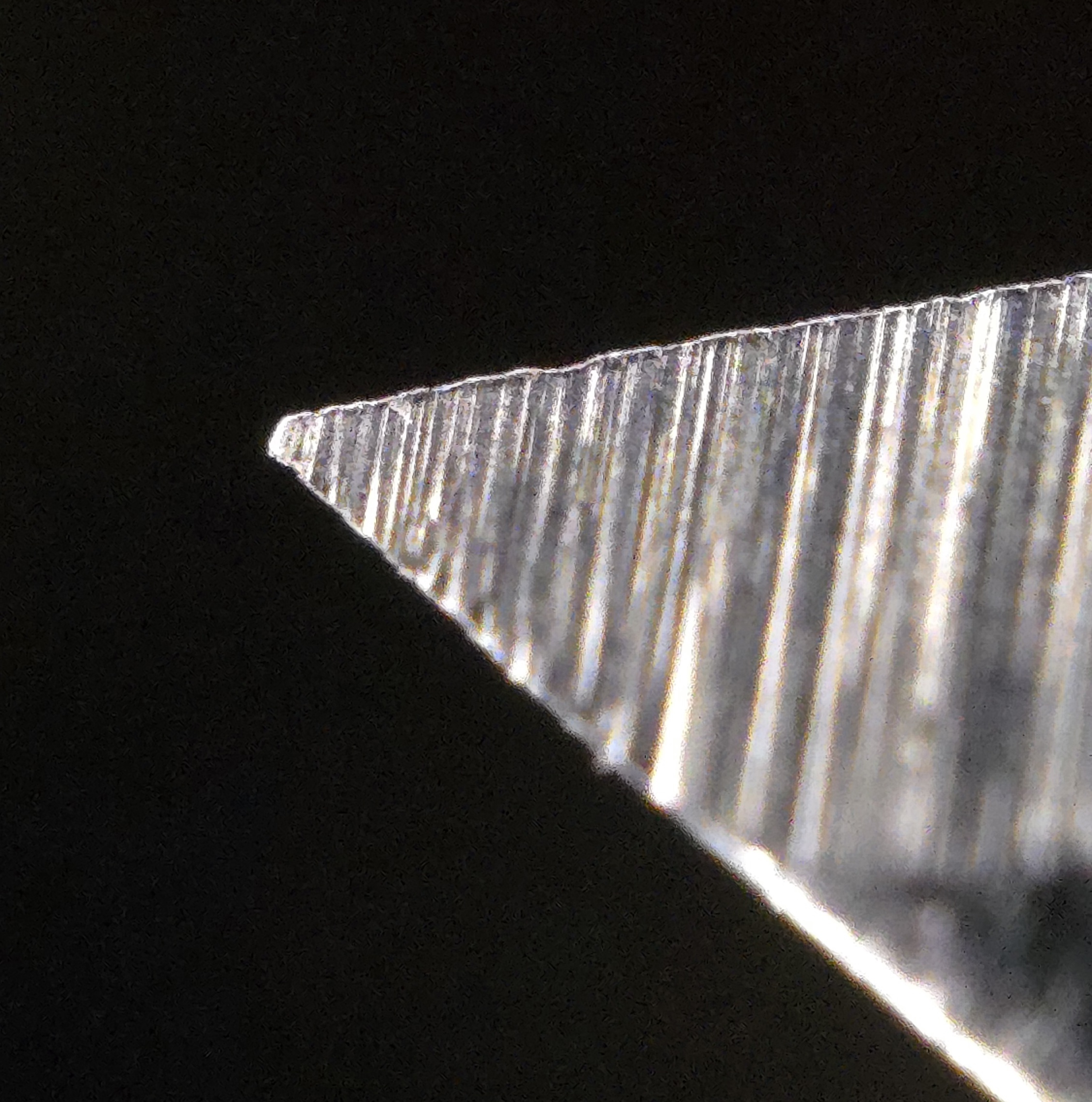 After running it across a 1200 grit diamond strop, the burr is gone and cutting clean printer paper much better now! The grind on the right side of the tip ended up being closer to 22° - I'll have to correct that when I reprofile to 17° for trying my own edge after the factory edge is done.